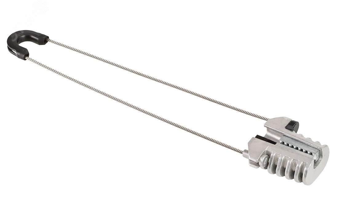 Предназначен для крепления и поддержки кабеля с обеспечением требуемого натяжения кабельной линии. Состоит из открытого конического корпуса, пары металлических зубчатых клиньев (зажимное устройство) и гибкой петли. Все детали соединены между собой и не могут быть утеряны. Устанавливается парами в начале, конце и в интервале 5-ти опор по протяженности кабельной линии. Обеспечивает значительное сокращение продолжительности процесса подвес кабеля.