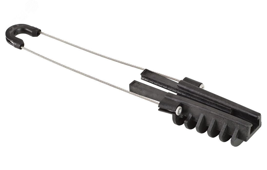 Предназначен для крепления и поддержки кабеля с обеспечением требуемого натяжения кабельной линии. Состоит из открытого конического корпуса, пары металлических зубчатых клиньев (зажимное устройство) и гибкой петли. Все детали соединены между собой и не могут быть утеряны. Устанавливается парами в начале, конце и в интервале 5-ти опор по протяженности кабельной линии. Обеспечивает значительное сокращение продолжительности процесса подвес кабеля.