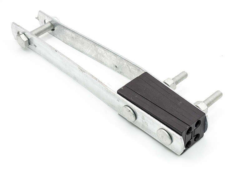 Зажим крепится на крюках и кронштейнах с помощью единственного болта. Прижимная часть клинового типа является саморегулируемой. Клинья легко раздвигаются благодаря пружине, что облегчает установку проводов.