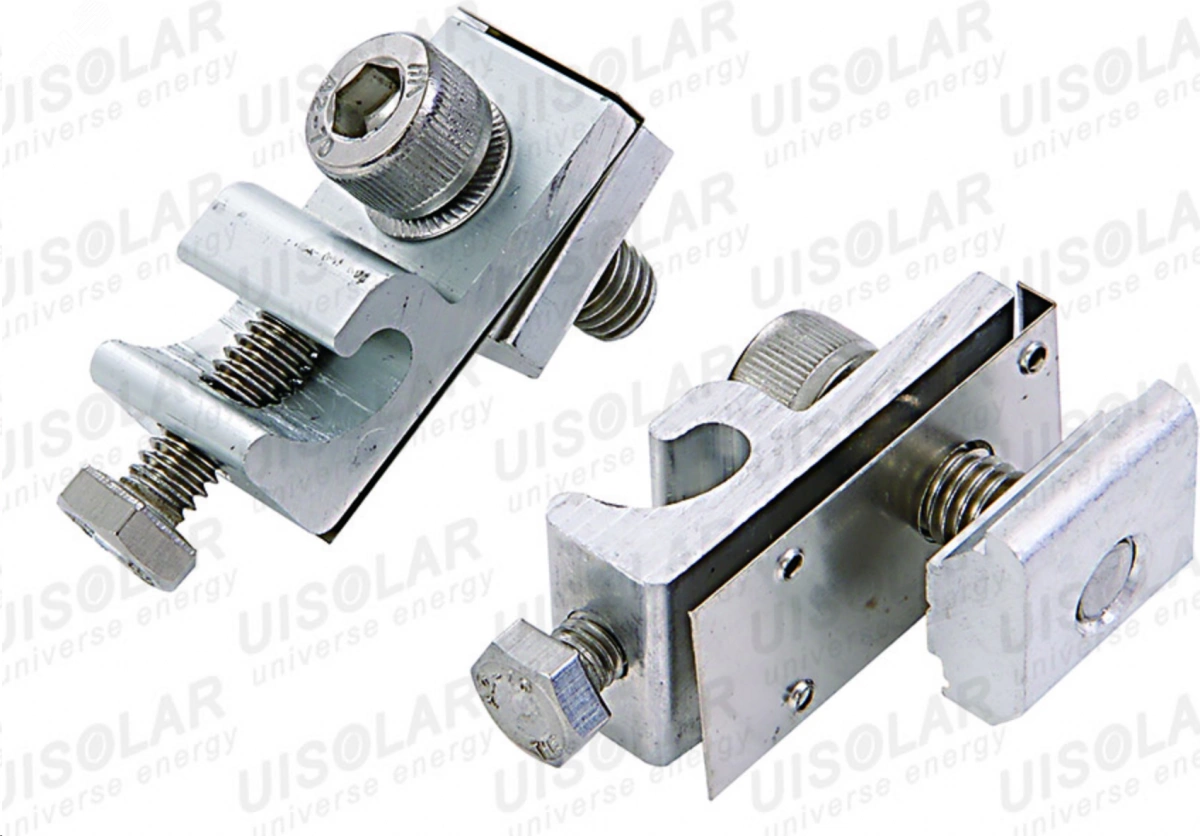 Зажим для заземления - применяется для надежного и быстрого подключения заземляющего проводника к конструкции крепления солнечных батарей. Зажим устанавливается на алюминиевый профиль с помощью профилированной гайки, далее в зажим заводится заземляющий проводник и затягивается болтом.
