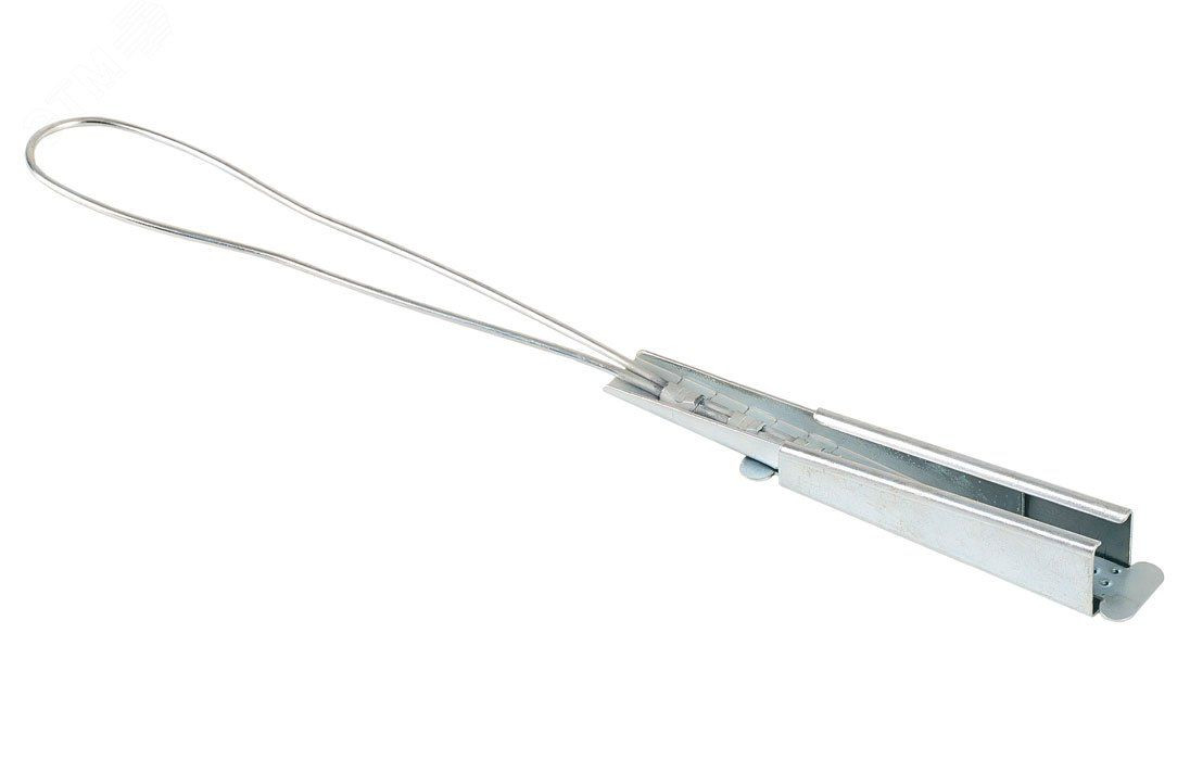 Используется для подвески плоского ОК на опорах линий связи, линий электропередач, столбах освещения, между зданиями и сооружениями. Состоит из открытого корпуса с ребристой контактной поверхностью, клина с прикрепленной проволочной петлей и ''''терки'''' - перфорированной вставки, которая прокладывается между кабелем и клином. Конструкция зажима обеспечивает прочное крепление кабеля. Материал изделия – корпус, клин, вставка и петля из оцинкованной стали. Рекомендуется использовать для всех участков кабельной трассы при практически любых углах ее поворота.
