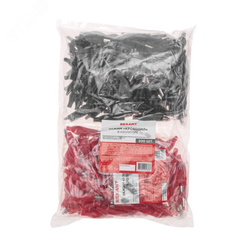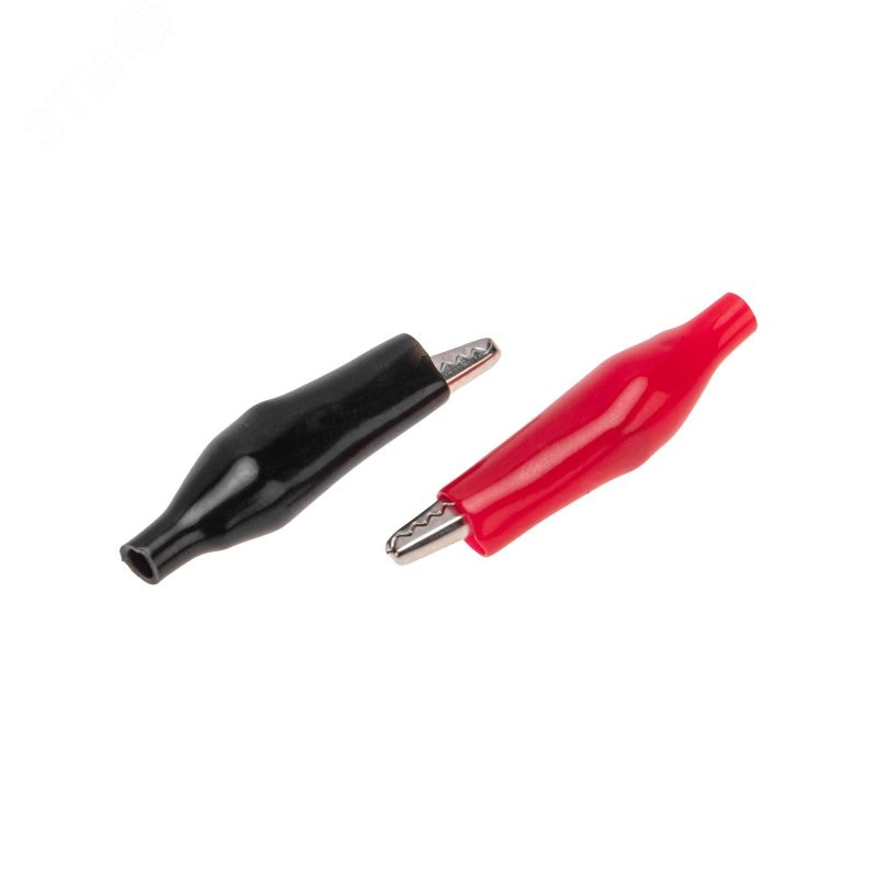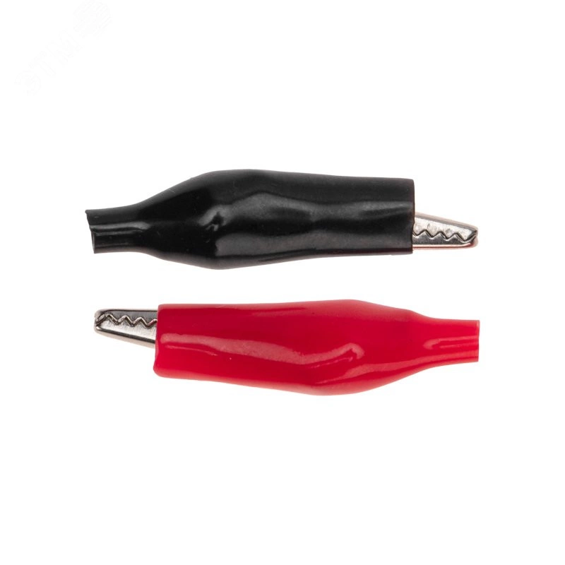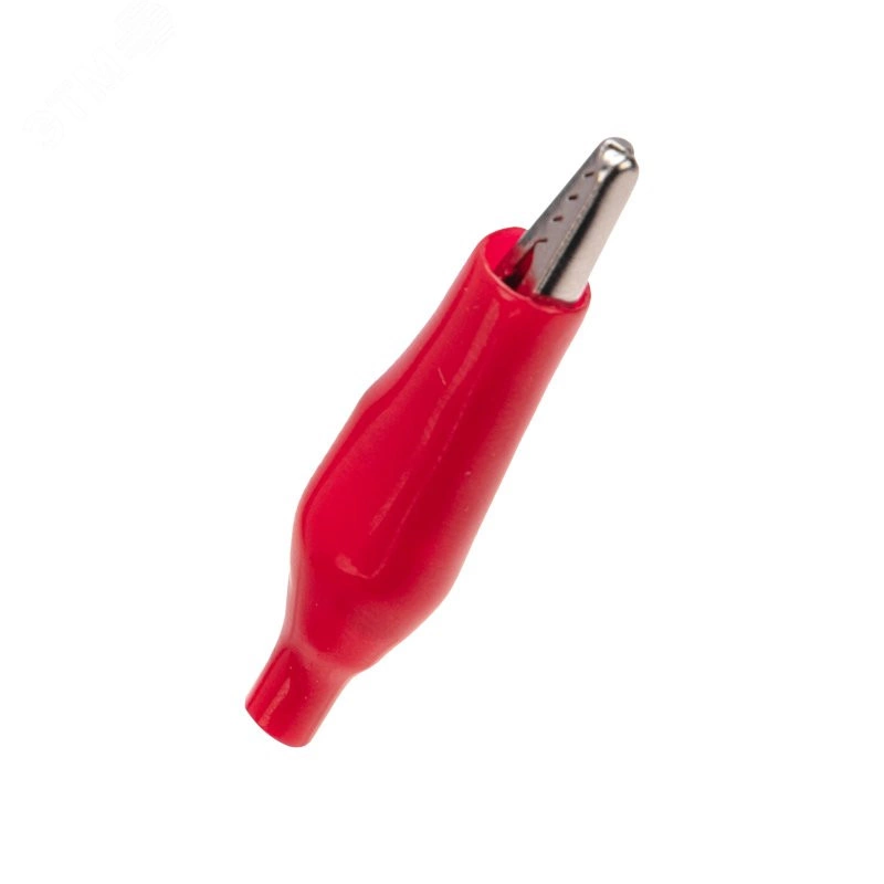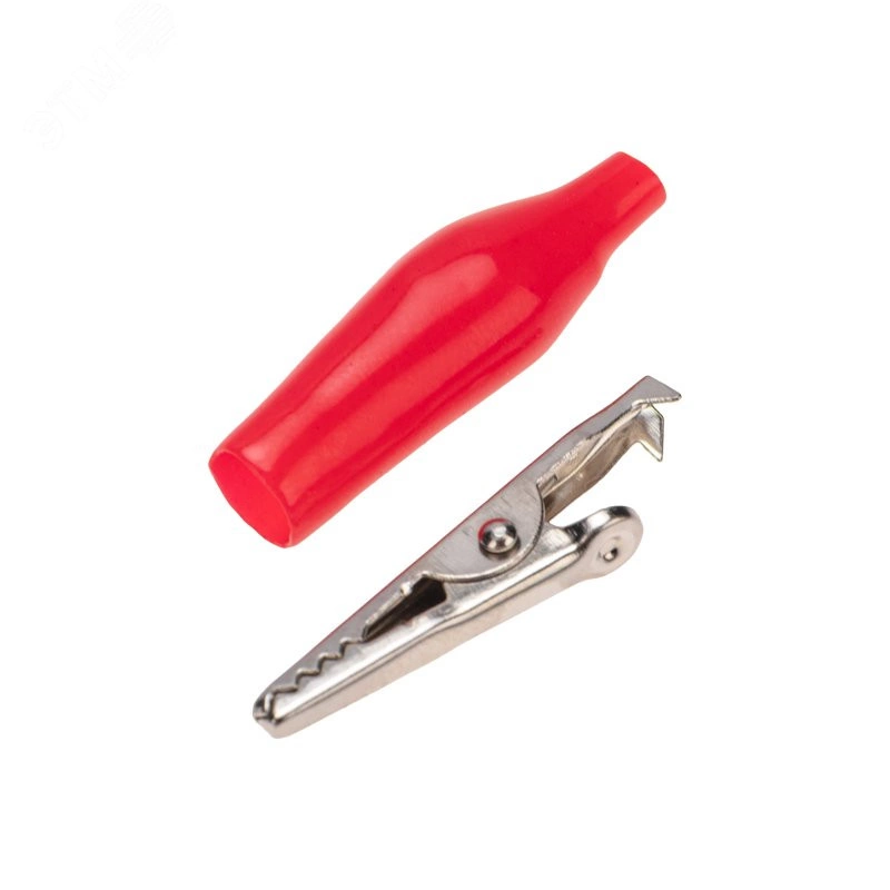 Зажим 'крокодил' 5А 46 мм в изоляторе представляет собой электромеханическое устройство, предназначенное для оперативного соединения или разъединения контакта проводов при выполнении измерительных работ или монтажа электрических и слаботочных сетей. Зажим получил свое название за схожесть с челюстями крокодила. Состоит он из двух фигурных деталей с 'крокодильими' зубцами, скрепленных серединами специальным штифтом и способных поворачиваться на некоторый угол вокруг оси соединения. К одной из деталей монтируется контактный провод. Сжатие 'челюстей' обеспечивается пружиной, вставленной с другой стороны штифта. Контактная часть изделия изготавливается из стали с никелированным покрытием и полностью закрыта изолятором.