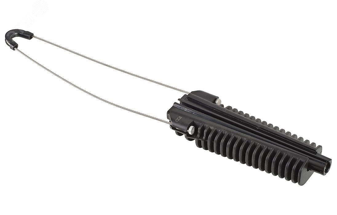 Зажимы натяжные клиновые типа АСADSS предназначены для подвески круглых самонесущих кабелей типа ОКСН диаметром от 8 до 20 мм при воздушной прокладке в пролетах до 100 м. Состоят из открытого конического корпуса, усиленного стекловолокном, пары пластиковых клиньев и гибкой петли из нержавеющей стали 500 мм.