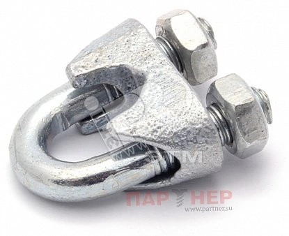 DIN 741 Зажим для стального троса, каната с двумя шестигранными гайками, легкое исполнение. Тросовый (канатный) зажим применяется для создания петель на концах тросов и для соединения стальных тросов, канатов между собой. Не предназначен для грузоподъёмных работ.